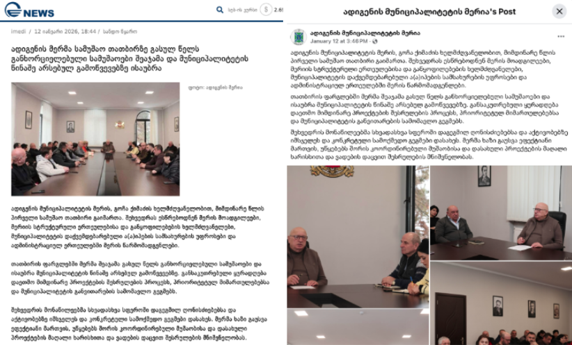 Imedi TV's report on Adigeni Municipality's concluding working meeting | Information of identical content published on Adigeni Municipality's Facebook page. |