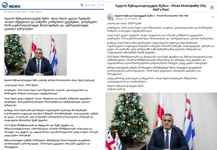 Imedi TV's report on Khulo Municipality Mayor's New Year's Greetings | Identical content published on Khulo Municipality City Hall's Facebook page |
