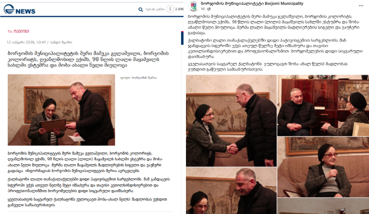 Information reported by Imedi TV, about the home visit by the Mayor of Borjomi Municipality to a distinguished local figure to extend New Year's greetings | Identical content published on Borjomi Municipality City Hall's Facebook page |