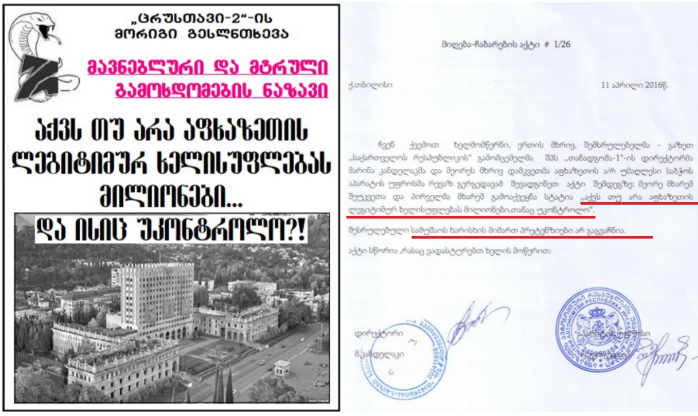 2016 წლის 9 აპრილს გაზეთმა “საქართველოს რესპუბლიკამ” გამოაქვეყნა ინტერვიუ აფხაზეთის მთავრობის წევრებთან და უმაღლესი საბჭოს დეპუტატებთან სათაურით - „აქვს თუ არა აფხაზეთის ლეგიტიმურ ხელისუფლებას მილიონები... და ისიც უკონტროლო”. პირველ გვერდზე, ასევე სტატიაში გამოტანილი იყო მასალის ანოტაცია: „ცრუსთავი 2-ის მორიგი გესლნთხევა... მავნებლური და მტრული გამოხდომების ნაზავი..."