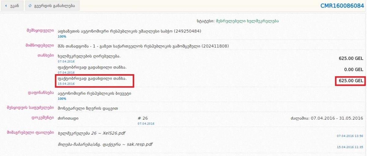 ამ დროისთვის არსებული მონაცემებით, გაზეთ „საქართველოს რესპუბლიკას“ აფხაზეთის ავტონომიური რესპუბლიკის უმაღლესი საბჭოსთან 2016 წელს სულ 1 225 ლარის ღირებულების კონტრაქტი აქვს გაფორმებული. მთლიანობაში სხვა საბიუჯეტო ორგანიზაციების ხელშეკრულებები აღნიშნულ გაზეთთან, 7 სექტემბრის მონაცემებით, 41 790 ლარის ღირებულებას შეადგენს, ხოლო 2015 წელს ამ მაჩვენებლმა 85 916 შეადგინა. 2013-2014 წლებში გაზეთის საბიუჯეტო შემოსავლები 63 923 ლარი იყო. აღსანიშნავია, რომ აფხაზეთის ავტონომიური რესპუბლიკაში შემავალი სხვადასხვა უწყება ხელშეკრულებებს წინა წლებშიც აფორმებდა.
