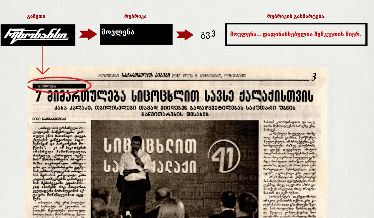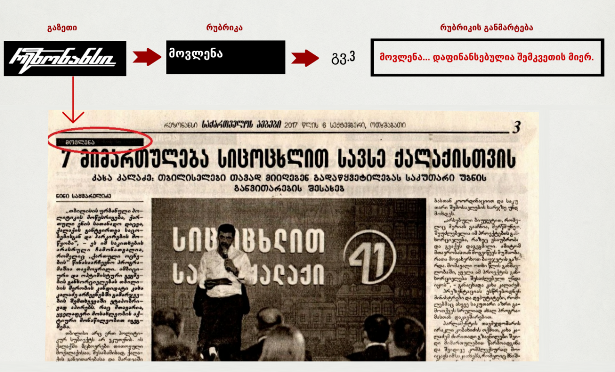 ჟურნალისტური ეთიკის ქარტიის მე-9 პრინციპის თანახმად, “სარედაქციო მასალები მკვეთრად უნდა გაიმიჯნოს მარკეტინგული, სარეკლამო და სპონსორის მიერ დაფინანსებული მასალებისაგან”. მოცემულ შემთხვევაში რუბრიკა “მოვლენის” (რომელიც გაზეთის ბოლო გვერდზე გაკეთებული განმარტების თანახმად, დაფინანსებული სტატიების კატეგორიას განეკუთვნება) დაფინანსებულ სტატიად აღქმა მკითხველისთვის რთული უნდა იყოს და ის შეცდომაში შემყვანია.