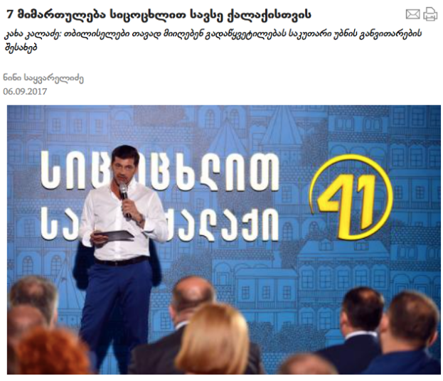 2017 წლის 6 სექტემბერს გაზეთმა რეზონანსმა გამოაქვეყნა მასალა, სათაურით ,,7 მიმართულება სიცოცხლით სავსე ქალაქისთვის”, რომელიც 2017 წლის ადგილობრივი თვითმართველობის არჩევნებზე მმართველი პარტიის ,,ქართული ოცნების” კანდიდატის კახა კალაძის საარჩევნო პროგრამის პრეზენტაციას შეეხება. სტატია, რომელსაც გაზეთის სრული მესამე გვერდი ეთმობა, რუბრიკაში “მოვლენა” გამოქვეყნდა და მისი ავტორი ნინი საყვარელიძეა.